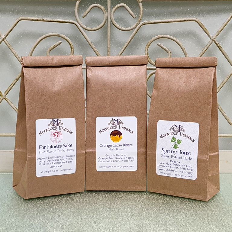 Orange Cacao Bitters: Organic: orange peel, dandelion root, cacao nibs, and gentian root. Makes a great all-purpose bitter that supports normal digestion and is also quite handy as a bitter for mixed drinks. 3.25oz bag $19.95 | enough for 1 pint of liquid extract.