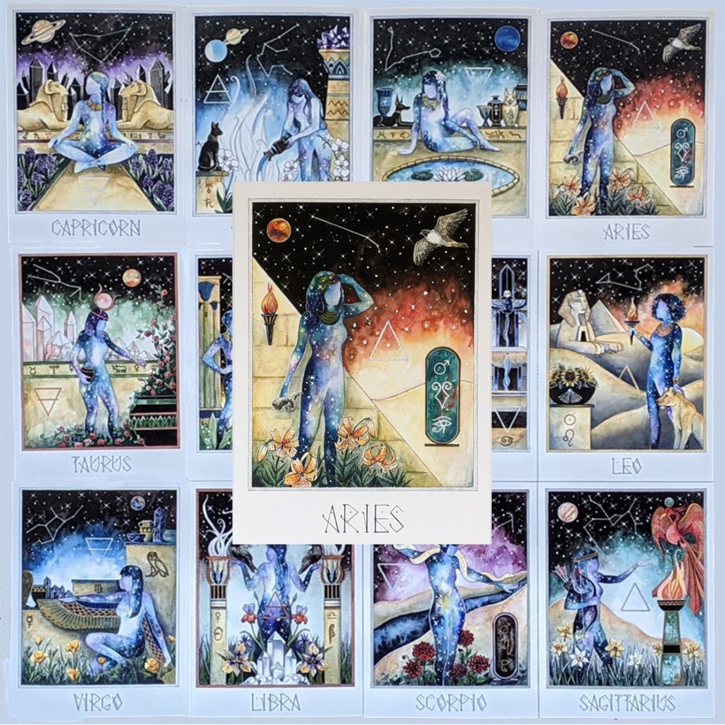 I first came upon Dana’s artwork when a piece of her work graced the cover of this year’s ‘We’Moon’ Astrological Datebook and Moon-phase Planner. Another piece of her work, honoring the lunar eclipse, found it’s way into my inbox through a group mailing. I decided it was time to look her up – and look what I FOUND! Gorgeous Celestial Egyptian Zodiac Greeting Cards (ready for framing), and mini prints! The greeting cards are blank inside and on the back of the card is a list of information for the sign, along with correspondences for element, metal, stone, color, & flower. Click on the picture to enlarge and get a better look at the detail on the center card, or better yet, come on in and take a look in person!