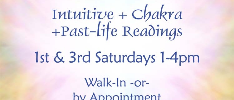 Gayle offers intuitive, past-life, and chakra readings from 1p – 4p. Walk-in or by appointment. 15 minute minimum.