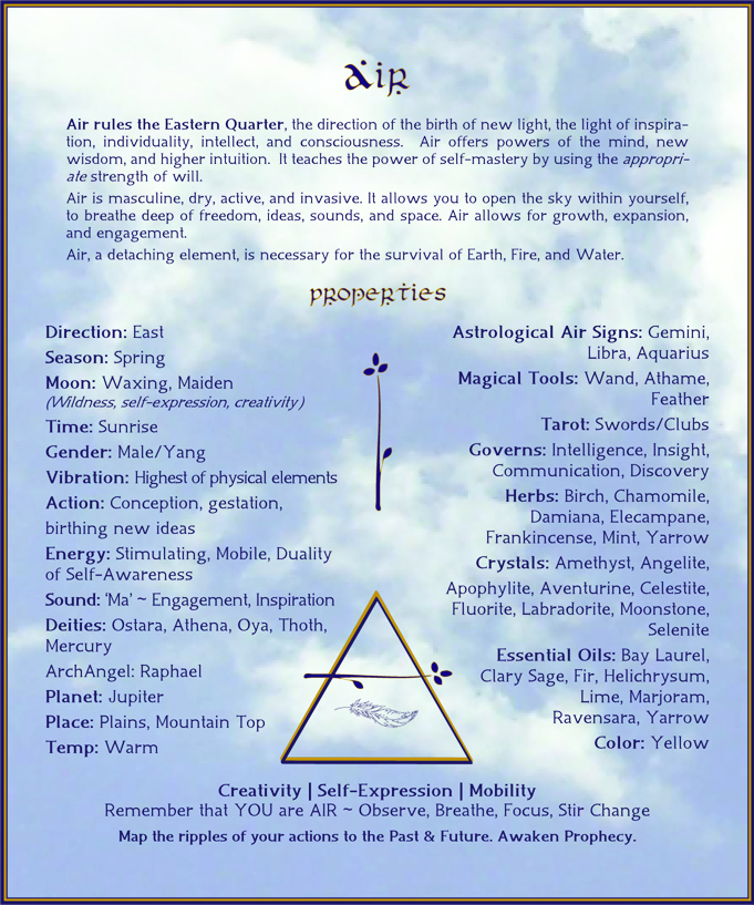 Air represents the conception of new ideas, a spark that seeks knowledge. It carries freedom to choose the direction you take. Air is the clear, uncluttered visualization that is essential in affecting change. It is the catalyst to manifestation.